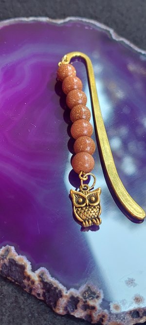 Könyvjelző - Homokkő ásvány gyöngyös arany színű, bagoly medállal