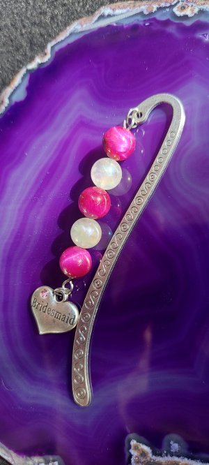 Könyvjelző - Tigrisszem és aurakvarc ásvány gyöngyös csigavonalas, bridesmaid feliratú medállal